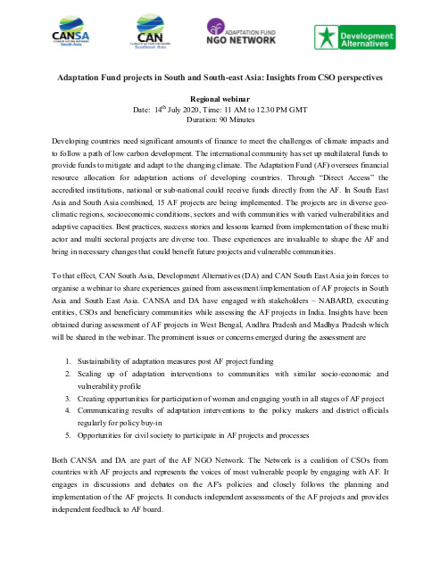 To that effect, CAN South Asia, Development Alternatives (DA) and CAN Southeast Asia join forces to organise a webinar to share experiences gained from assessment/implementations of AF projects in South Asia and Southeast Asia. CANSA and DA have engaged with stakeholders – NABARD, executing entities, CSOs and beneficiary communities while assessing the AF projects in India. Insights have been obtained during assessment of AF projects in West Bengal, Andhra Pradesh and Madhya Pradesh which will be shared in the webinar. The prominent issues or concerns emerged during the assessment are: