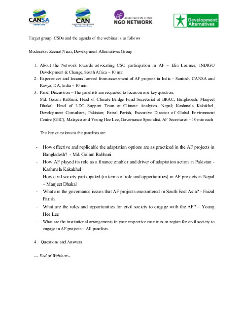 - About the Network towards advocating CSO participation in AF – Erin Lorimer, INDIGO Development & Change, South Africa – 10 min